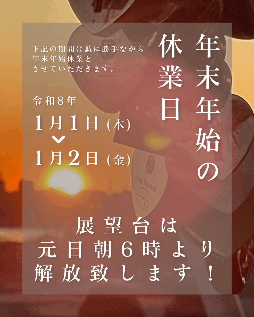 HOME > お知らせ > お知らせ 年末年始の休業のお知らせ 投稿日:2025年12月25日 こんにちは、道の駅かぞわたらせです。 いつも当店をご利用いただき誠にありがとうございます! 年末年始のお知らせです。 誠に勝手ながら1月1日、2日は年末年始休業とさせていただきます。 なお展望台は1日、2日と朝6時から解放しておりますので、 ぜひ初日の出を見に来てください! 来年も道の駅かぞわたらせをよろしくお願いいたします。 -お知らせ